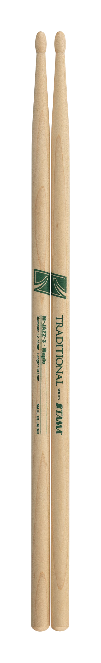 Le bacchette TAMA M-JAZZ-3 della serie Traditional sono realizzate in acero leggero, progettate per offrire un tocco morbido e un controllo facile a volumi bassi. Questo modello presenta un'impugnatura estremamente sottile, con un diametro di 12,75 mm, e una punta ovale. La punta ovale produce una varietà di suoni dallo strumento a seconda dell'angolazione con cui si colpisce la superficie. Questo modello è ideale per situazioni che richiedono una varietà di suoni a basso volume.
