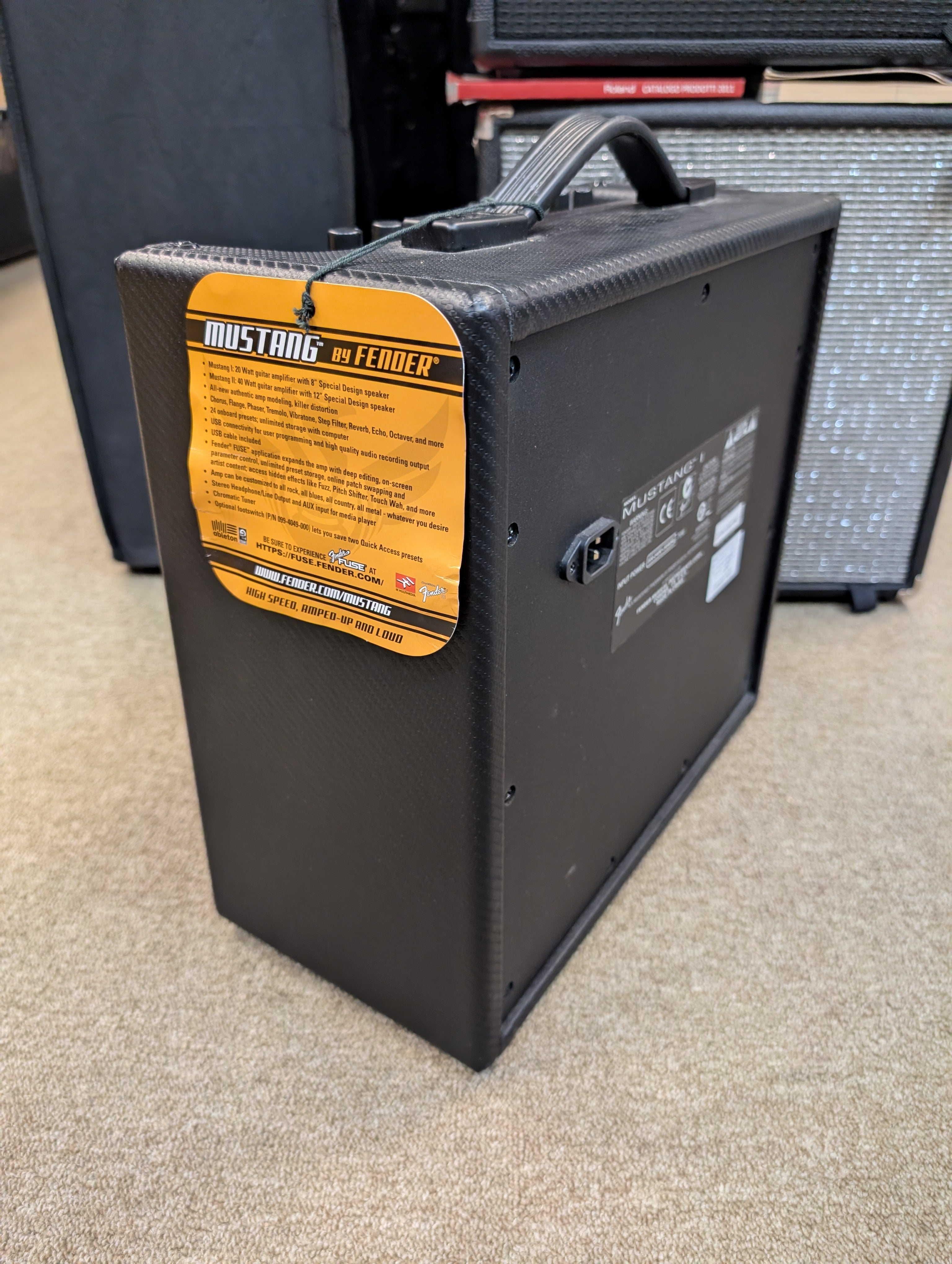 Il Mustang I contiene 24 modelli estremamente accurati di amplificatori con toni che vanno dai brillanti suoni Fender fino alle scandalose distorsioni del metal moderno. Si connette facilmente al tuo computer per aggiungere altri modelli di amplificatori. I 24 amp singoli sono disposti in tre banchi di 8 (cioè, tre '57 Deluxe preset, tre anni '60 Brit preset, ecc.) Questi preset sono facilmente richiamabili con la manopola "preset" (o dal pedale o dal computer). Ruotate questa manopola per scorrere ciascuno dei tre banchi di preset, che sono indicati sul pannello di controllo da colonne LED colorati ambra, verde e rossi. La rossa e la verde sono per la creazione di preset, i banchi ambra possono essere modificati solo con Fender FUSE (applicazioni software fender).