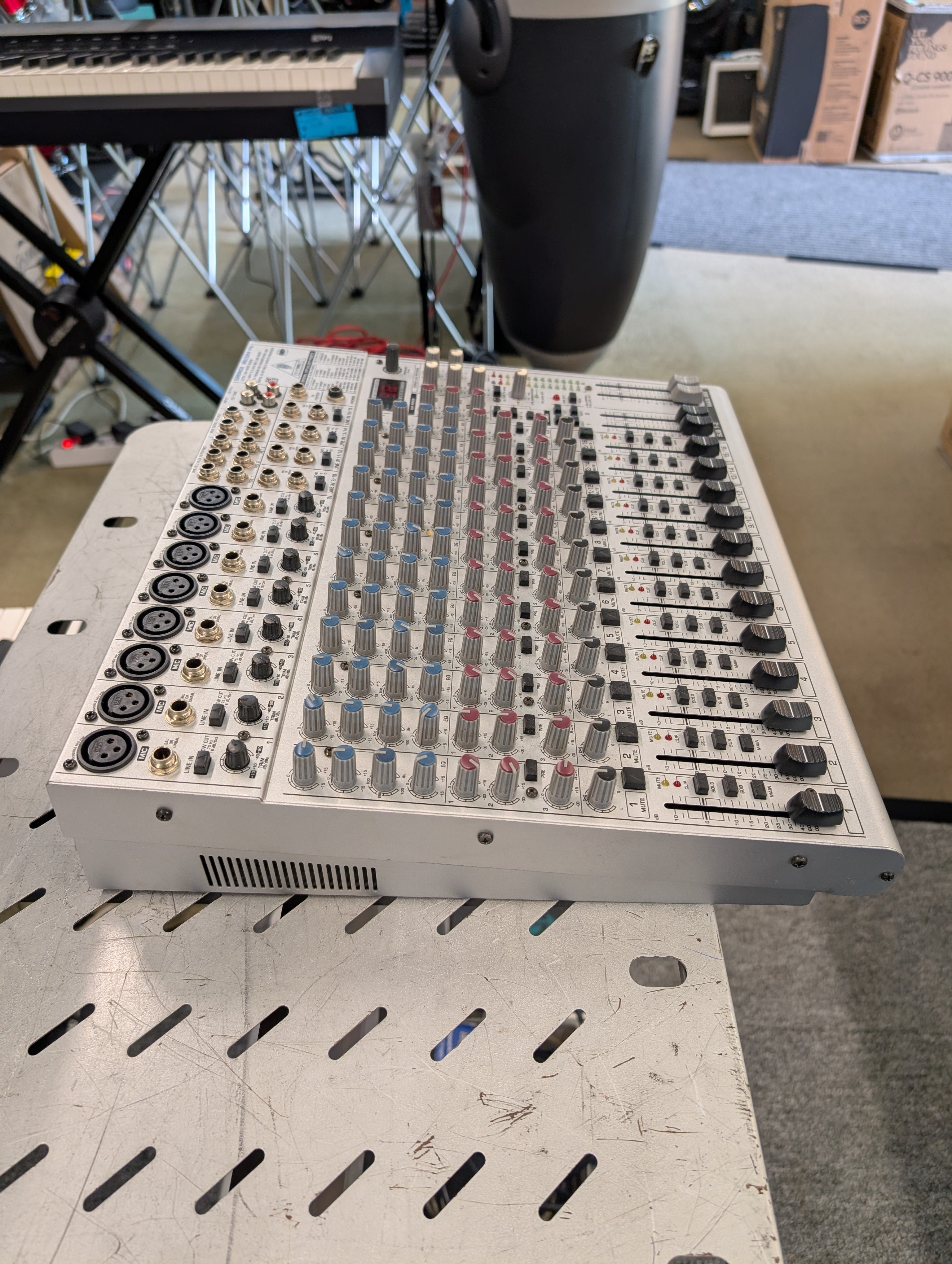 Questa è la nostra seconda console più grande dell'intera serie di console di missaggio UB. Dispone di 16 ingressi di linea bilanciati ad alta dinamica, 8 preamplificatori microfonici invisibili (IMP), 3 mandate ausiliarie per canale (1 pre fader per il monitoraggio, 1 pre/post fader commutabile per applicazioni di monitoraggio/effetti e 1 post fader per effetti interni o come mandata esterna). Sono presenti equalizzatori a 3 bande efficaci ed estremamente musicali con bande medie semi-parametriche e filtri low-cut commutabili su tutti i canali mono. Sono inoltre presenti 2 sottogruppi con uscite separate per una maggiore flessibilità di routing e 3 ritorni ausiliari stereo multifunzionali con routing flessibile. Troverete anche il processore effetti stereo digitale a 24 bit integrato con 99 preset VIRTUALIZER dal suono eccezionale.